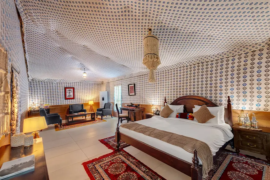 One of the biggest highlights of statue of unity tent city-1 is the beautifully designed cottages that combine luxury with nature. Guests enjoy comfortable beds, elegant interiors, and modern facilities that make their stay relaxing.